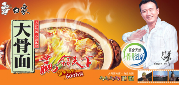 采納專家經(jīng)過調(diào)研創(chuàng)意,創(chuàng)意出了白象大骨面,并且對白象大骨面進(jìn)行了區(qū)隔定位:大骨熬湯、身強(qiáng)力壯,骨膠原的營養(yǎng)這個(gè)層面,凸顯了白象大骨面的價(jià)值,因此推出了廣告語“白象大骨面,大骨營養(yǎng)在里面”,該品類獲得了極大的成功,當(dāng)年帶動白象銷量突破9億。