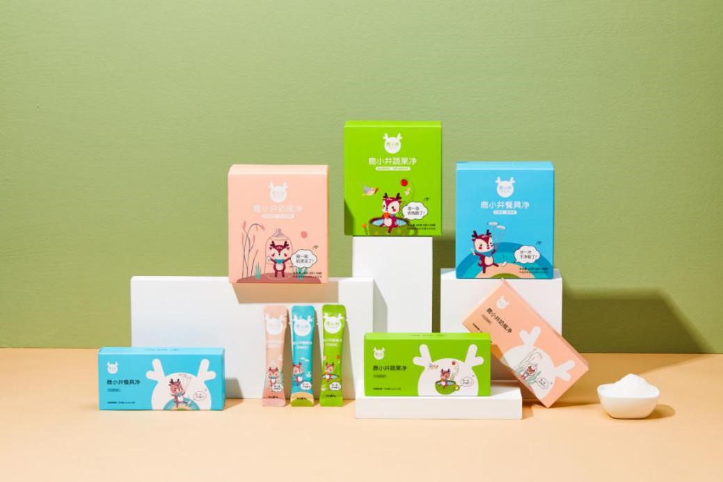 有餐具凈、蔬果凈、奶瓶?jī)?,盒裝、試用裝、瓶裝各三款,畫(huà)面以IP形象設(shè)計(jì)與產(chǎn)品功能元素結(jié)合,呈現(xiàn)出鹿小井品牌專屬畫(huà)面,將更健康的清洗生活方式帶給萬(wàn)千消費(fèi)者!